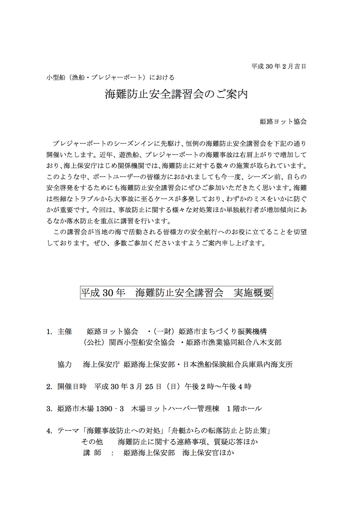 この講習会が当地の海で活動される皆様方の安全航行へのお役に立てることを切望しております。ぜひ、多数ご参加くださいますようご案内申し上げます。