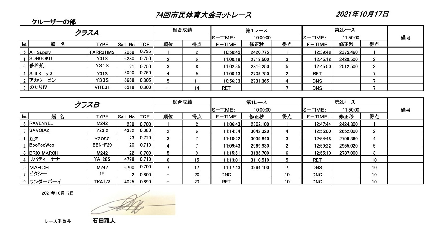 第74回姫路市民体育大会ヨットレース:クルーザーの部 |