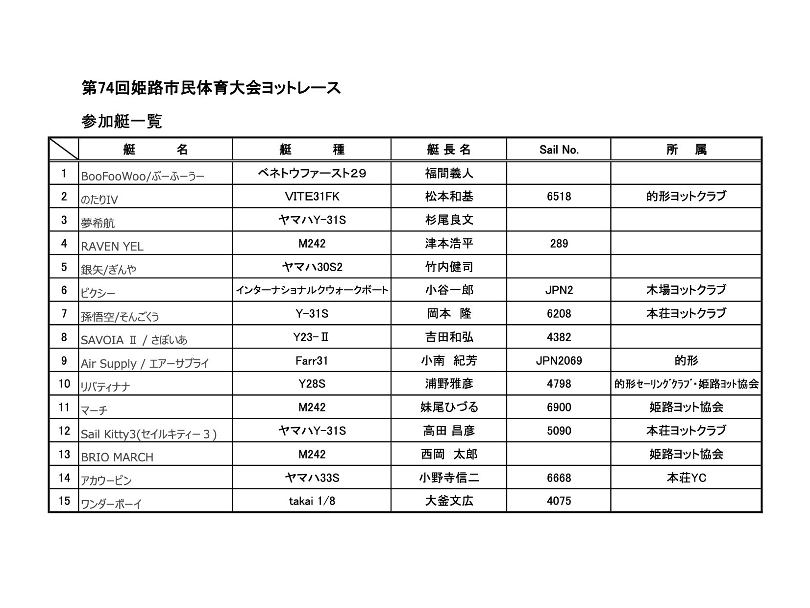 | (7)公示 | < 【公示】第74回姫路市民体育大会ヨットレース クルーザーの部 > |