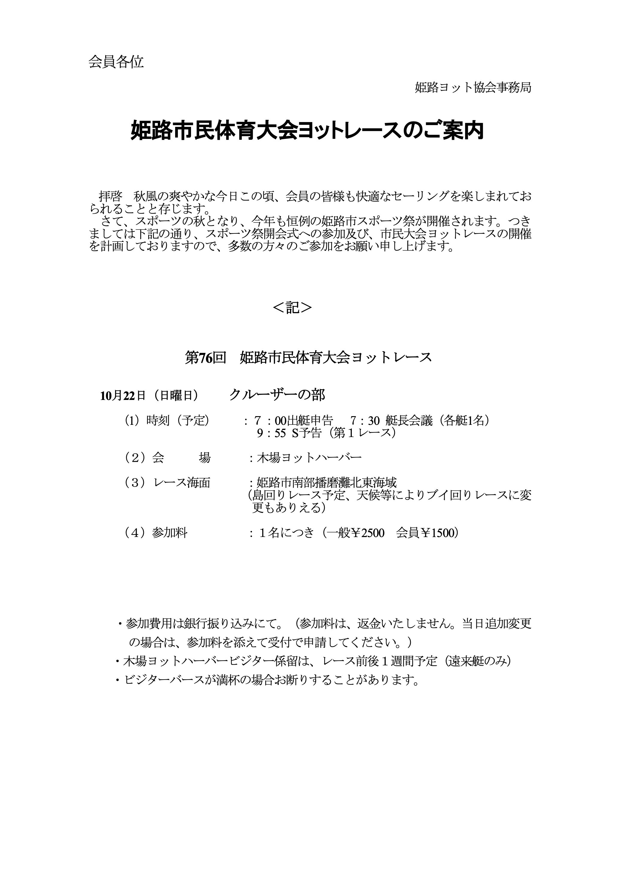 大会名称 :第76回姫路市民体育大会ヨットレース クルーザーの部