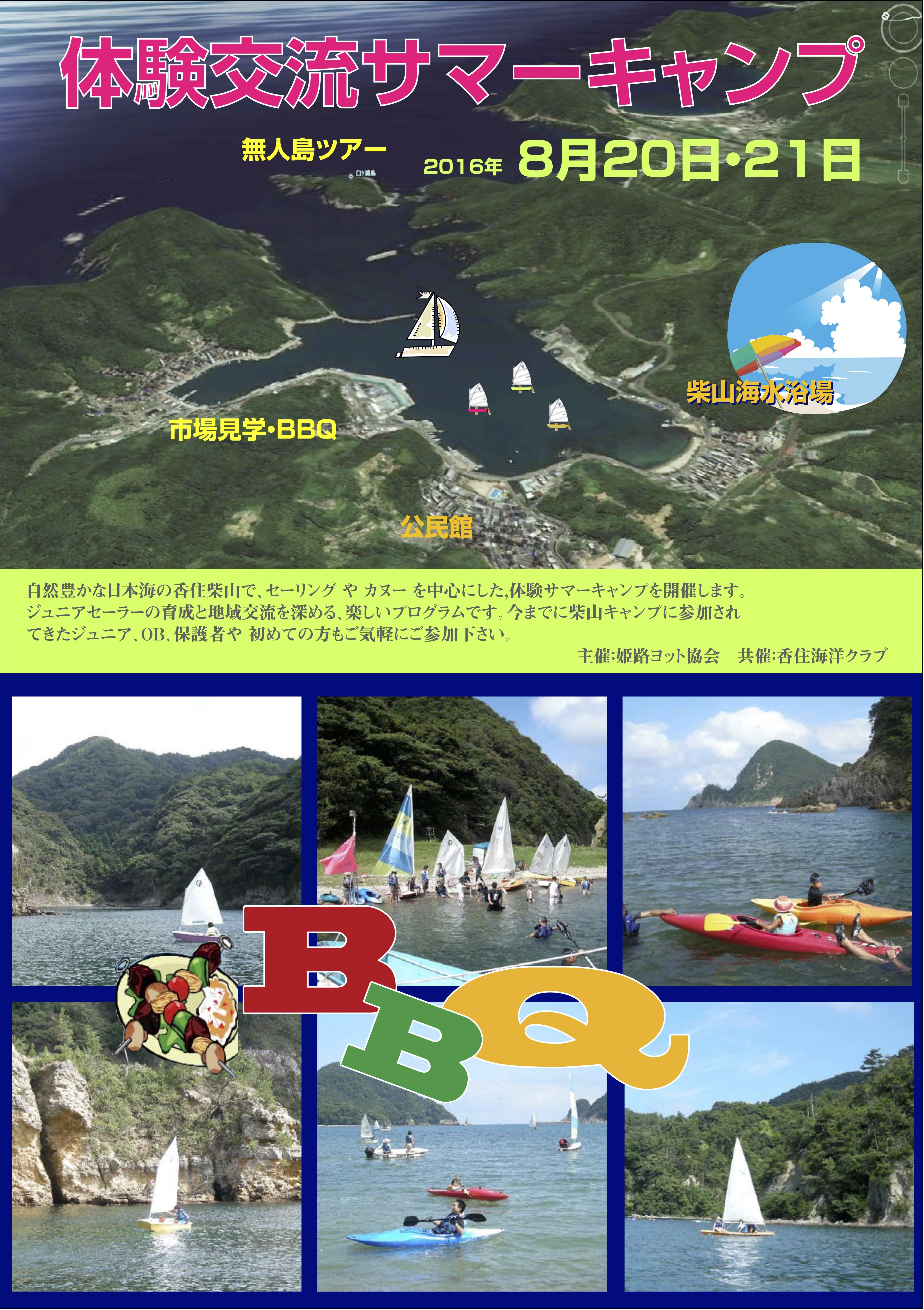 ジュニア・ユースセーラー・一般ビギナーを対象に、自然豊かな日本海(香住柴山)でセーリングを中心にした、体験サマーキャンプを開催します。一般参加(ヨット・カヤックに興味のある方)も大歓迎です。また、今までに柴山キャンプに参加されてきたジュニアOBはじめ、保護者のみなさまにもぜひご気軽に参加いただき、ジュニアセーラーの育成と地域交流を深める、楽しいプログラムを計画しています。ぜひふるってご参加下さい。